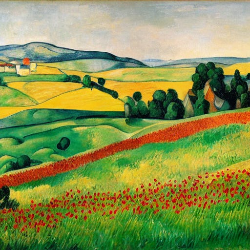“And this one,” he pointed to another, a scene of the French countryside. A foreground of red poppies on green stems framed a golden field of grain. The white walls and red tile roofs of a farmstead stood in the middle distance, backed by a round-topped blue mountain ridge in the hazy background.